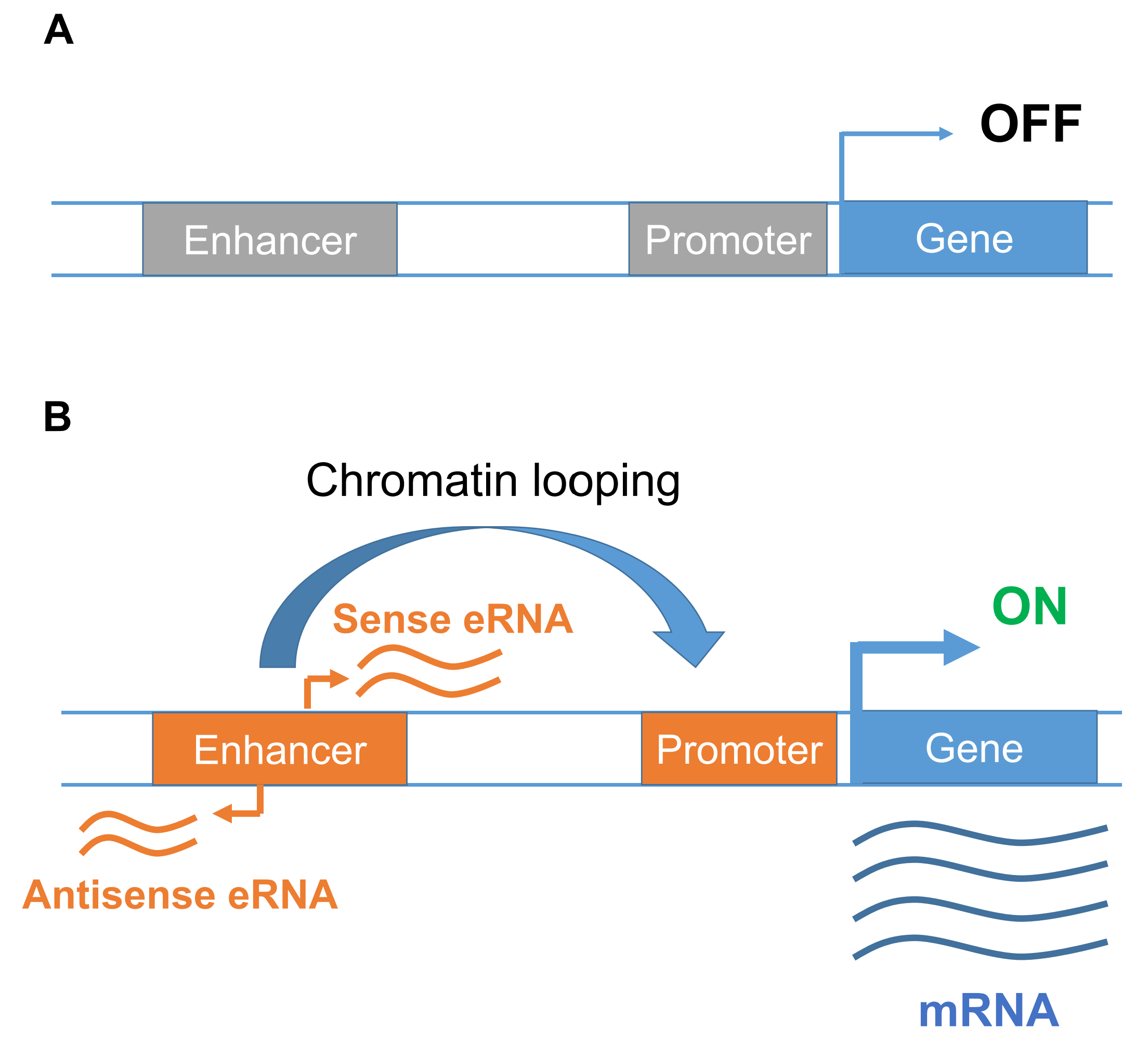 早期研究认为增强子转录的RNA(eRNA)是由enhancer折叠到靶基因promoter附近时,招募的RNA聚合酶II结合产生的噪音,作为一种转录调控的副产物,因此eRNA的定义与功能尚不明确,是目前新兴的研究对象之一。