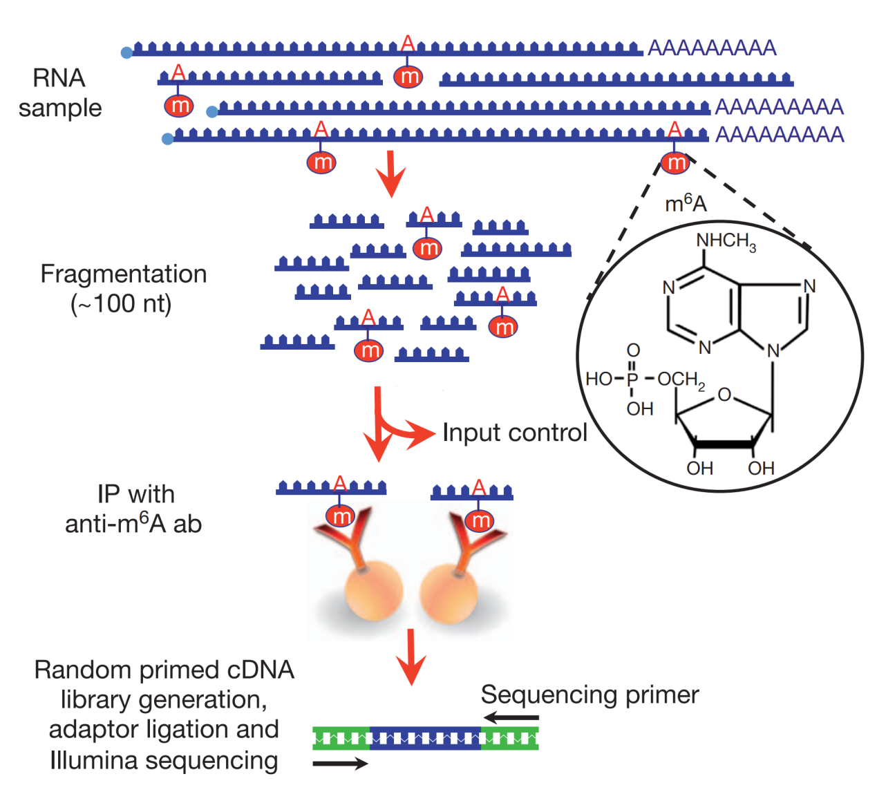 RNA修饰是指发生在RNA分子上的各种化学修饰(已超160种),每种修饰都有相应的功能,如:稳定结构、出核运输、可变剪接、翻译识别等。其中甲基化修饰是主要形式之一,约占2/3,RNA的甲基化修饰多位于mRNA、tRNA、rRNA和其他非编码RNA上。其中m6A修饰(N6-methyladenosine),是指在RNA腺嘌呤第6位氮原子上的甲基化修饰,修饰位点附近序列高度保守,随着NGS的广泛应用,RNA修饰得到了广泛研究,已是表观遗传领域的热点,而MeRIP-seq则是研究m6A修饰强有力的技术之一。