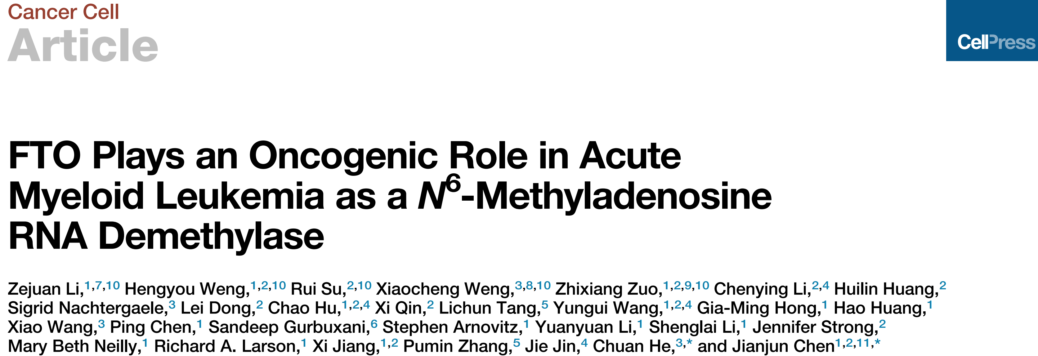 2016年,《Cancer Cell》杂志刊发了陈建军、何川课题组共同完成的研究成果,文章报道了FTO作为6甲基腺苷脱甲基酶(m6A demethylase),在急性髓白血病(AML)中扮演着重要角色。FTO在多种AML(染色体重排、突变等)中高表达,其通过降低mRNA转录本的m6A修饰水平来调节ASB2,RARA等靶基因的表达,可以促进由白血病原癌基因介导的细胞转化、白血病发展,并且抑制全反式维甲酸(ATRA)诱导的AML细胞分化,证明了m6A甲基化和相应蛋白在癌症中的功能重要性,并为白血病的发生和药物反应提供了指导性见解。