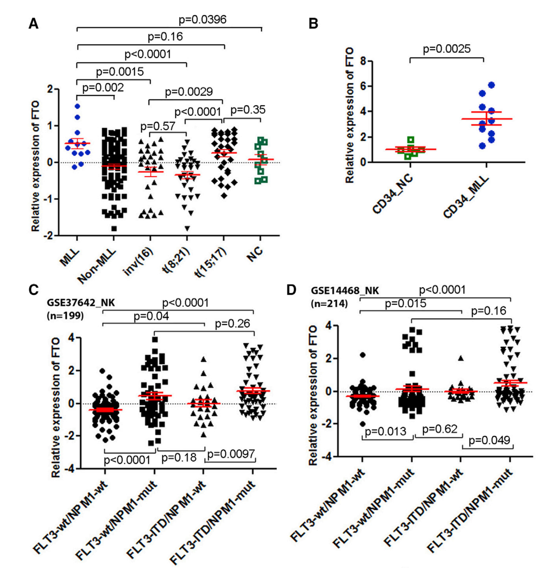 在本研究中,证明了FTO,一个肥胖风险相关基因和第一个被发现的m6A橡皮擦,在造血细胞转化和白血病发生中起着关键的致癌作用。简言之,FTO表达可由某些致癌蛋白质(例如,MLL融合蛋白、PML-RARA、FLT3-ITD和NPM1突变体)上调,因此FTO在AML的某些亚型中异常上调,例如t(11q23)/MLL重排、t(15;17)、FLT3-ITD和/或NPM1突变的AML。