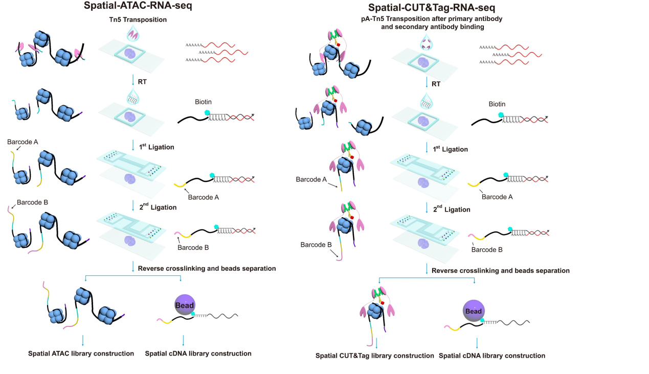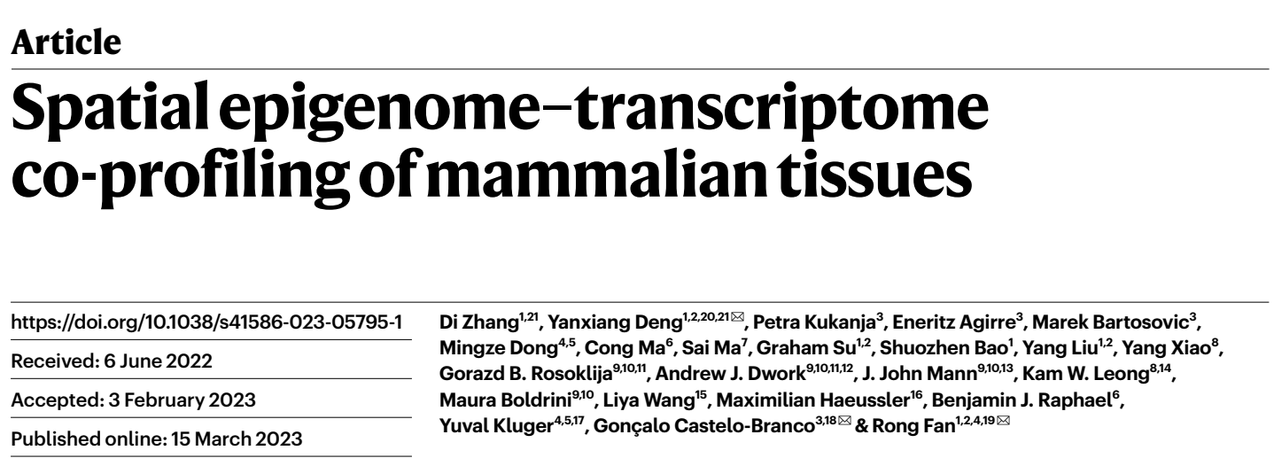 2023年3月15日,耶鲁大学樊荣教授团队和卡罗林斯卡学院Gonçalo Castelo-Branco教授团队合作,在《Nature》上在线发表了题为 Spatial epigenome–transcriptome co-profiling of mammalian tissues 的最新空间多组学技术。除了成功实现整个领域期待的在同一组织样品上实现总体染色质可及性和基因表达的联合空间组学分析(Spatial ATAC–RNA-seq),这个工作同时报道了三个特定的组蛋白修饰和基因表达的联合分析(Spatial CUT&Tag–RNA-seq),和单细胞数据整合显示这些技术达到了细胞水平或近单细胞分辨率。这个工作能够在空间和全基因组水平上观察表观遗传机制如何在组织中控制转录表型和细胞动态,揭示组织结构中空间表观遗传启动、分化和基因调控的新见解。该技术将在生命科学和生物医学研究领域引起广泛兴趣。