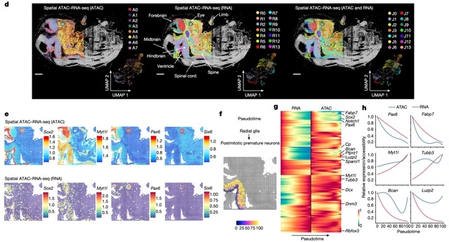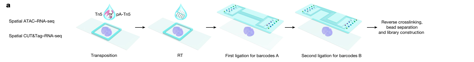 在研究中,对Spatial ATAC–RNA-seq技术,研究人员使用甲醛固定的冰冻组织切片,首先用预装有DNA adapter的Tn5转座酶复合物进行处理,随后将同一组织切片在包含生物素,连接序列和poly-T的DNA adapter中孵育以启动逆转录。之后,在组织切片上依次放置两个方向垂直的微流控芯片,分别引入空间编码Ai (i = 1−50或100)和Bj (j = 1−50或100),从而形成一个二维的、由空间编码定义的组织像素网格,每个像素点由Ai和Bj编码 (总编码像素数= 2,500或10,000)。最终得到组织中组蛋白修饰和转录组的空间共同分析结果。